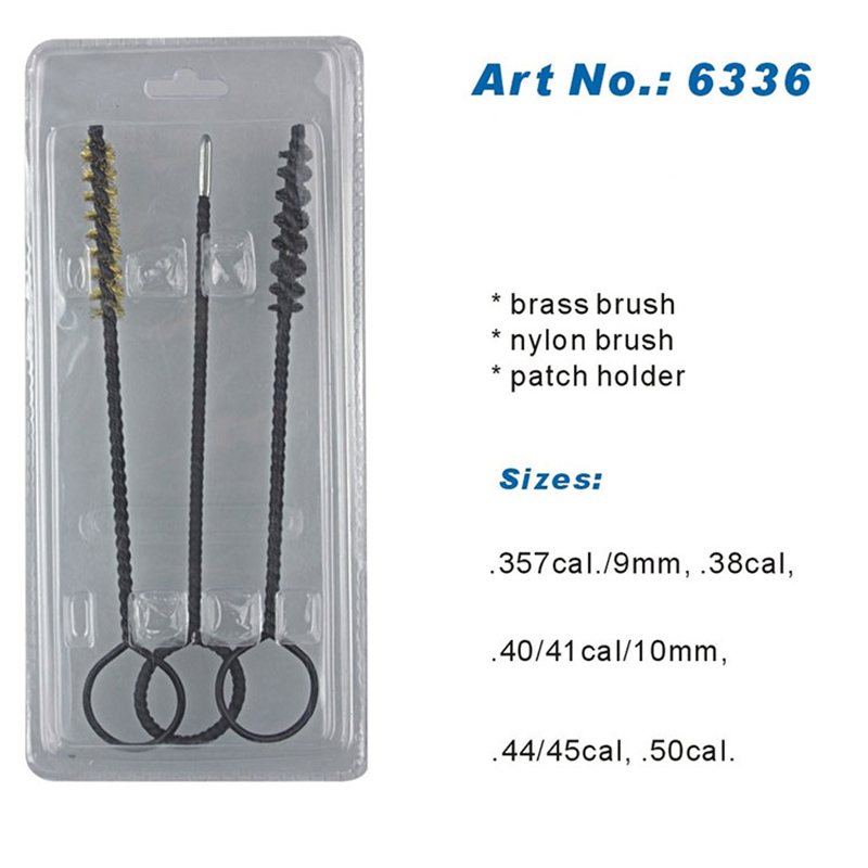 9 mm-es pisztolytisztító készlet buborékcsomagolásban ● Elérhető méretek:9mm.10mm..45cal.. ● A nagy teherbírású kefék és a hornyolt tapasztartó alkalmas a furatok tisztítására. ● Dupla buborékfólia csomagolás. ● Az összes 3 DB műalkotás jó minőségű horganyzott acélból csavarva, nagy gyűrűkkel. ● Könnyen felhelyezhető az OEM vagy az ügyfél botja és logója