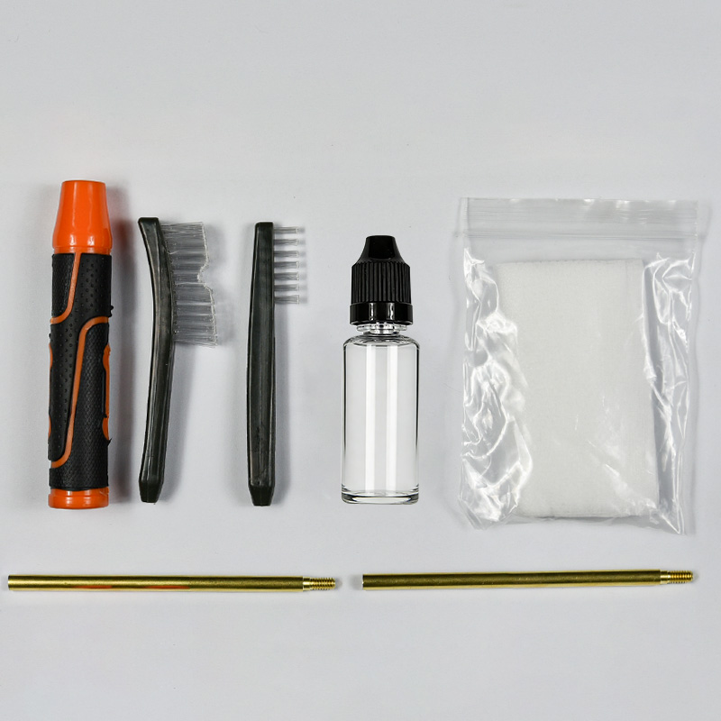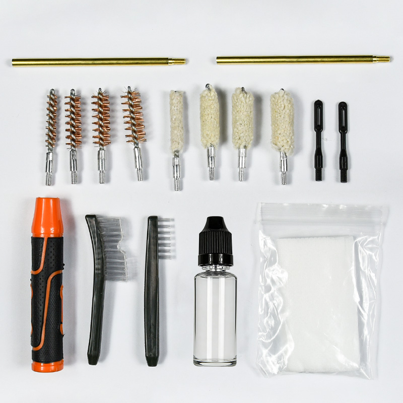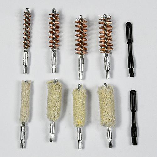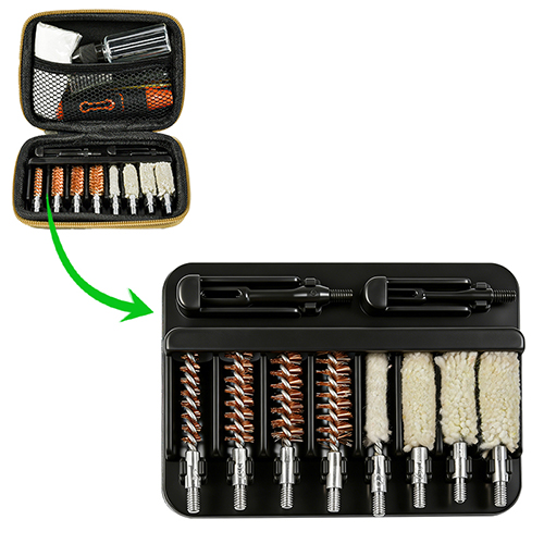 A pisztolytisztító készlet 4 méretet tartalmaz (.22, 9mm, .40, .45 cal.). OX szövet bevonattal PVC tok cipzárral. Sárgaréz kefék és pamut felmosók, 2 rúd. Homok és fekete szín a választáshoz.