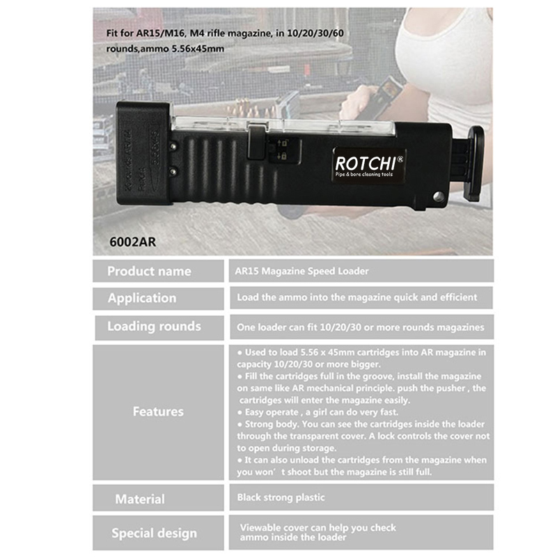 Magazin Speed Loader AR15-höz ● 5,56 x 45 mm-es kazetták betöltésére szolgál AR tárba 10/20/30 vagy nagyobb kapacitású. ● Töltse fel teljesen a patronokat a horonyba, szerelje be a tárat az AR mechanikai elv szerint. nyomja meg a tolót, a patronok könnyen bejutnak a tárba. ● Könnyen kezelhető, egy lány nagyon gyorsan tud. ● Erős test. Az átlátszó burkolaton keresztül láthatja a patronokat a rakodó belsejében. A zár vezérli, hogy a burkolat ne nyíljon ki tárolás közben. ● Akkor is ki tudja tölteni a patronokat a tárból, ha nem lő, de a tár még mindig tele van.