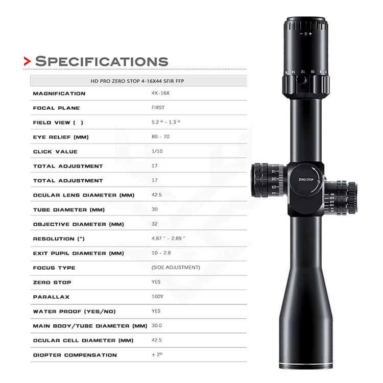 ZERO STOP 4-16X44 SFIR FFP-A 30 mm átmérőjű HD fényáteresztő Zero Stop vadásztáv Ffp